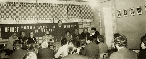 На праздновании 50-летия Днепропетровского шахматного клуба выступает один из старейшин Александр Акимович Дышлис. У стола стоят директор клуба Николай Васильевич Грива и председатель областной федерации шахмат Евгений Иосифович Урих