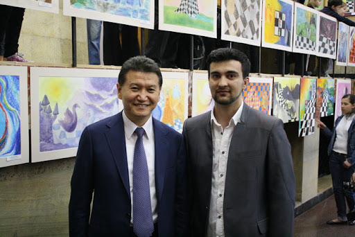 Президент FIDE Кирсан Илюмжинов и международный гроссмейстер Игорь Коваленко, один из ярких представителей региональной шахматной школы, первый гроссмейстер из Новомосковска, на выставке детских рисунков «Я мир сравнил бы с шахматной доской…» (апрель 2012 года)
