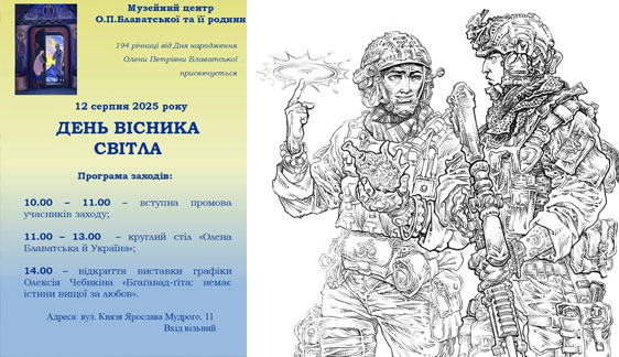 12 серпня у Музейному центрі О.П. Блаватської та її родини відбудеться презентація виставкового проєкту «Бгаґават-ґіта: немає істини вищої за любов», який присвячено 194-й річниці від Дня народження Олени Петрівни Блаватської.