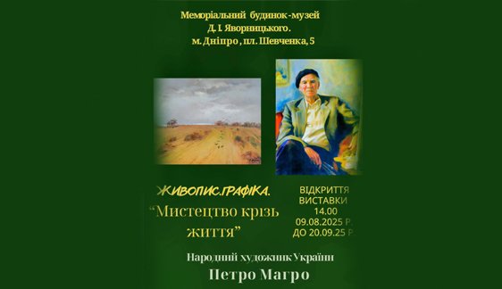 Меморіальний будинок-музей Дмитра Яворницького запрошує на виставку ” МИСТЕЦТВО КРІЗЬ ЖИТТЯ. Народний художник України ПЕТРО МАГРО. Живопис, графіка”.