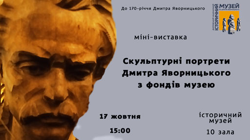 17 жовтня о 15:00 в Дніпропетровському національному історичному музеї імені Д. І. Яворницького відбудуться відкриття міні-виставки «Скульптурні портрети Дмитра Яворницького з фондів музею» в рамках виставки «Дмитро Яворницький. Життя. Колекції. Спадщина».