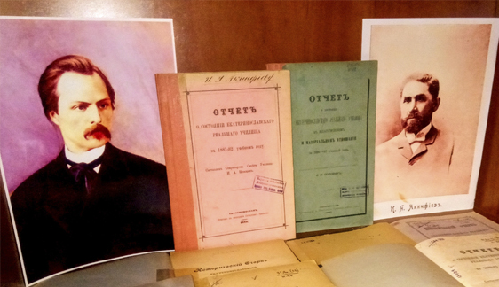 Книжкова виставка складається передусім із раритетів кінця ХІХ – початку ХХ ст. Це рідкісні видання, пов’язані саме з процесом заснування та становлення реального училища. Передусім, це випуски звітів про стан та навчальну діяльність училища за різні роки. Зокрема «Отчет о состоянии Екатеринославского реального училища в 1881-82 учебном году» (1882), «Отчет о состоянии Екатеринославского реального училища в педагогическом и материальном отношении за 1885-86 учебный год» (1886), аналогічні звіти за 1886/1887, 1887/1888 та 1915/1916 навчальні роки. Складені звіти секретарями Ради училища І.А. Невським та Ф.М. Поповим.