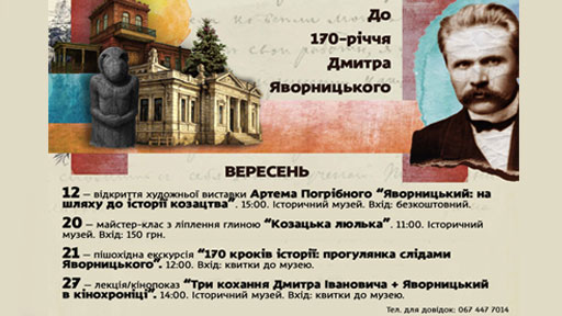 Перший захід через тиждень, 12 вересня, в п’ятницю. Відкриття художньої виставки з Харкова «Яворницький: на шляху до історії козацтва» о 15:00 в історичному музеї.