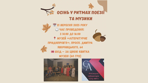 Друзі! Запрошуємо 21 вересня до музею “Літературне Придніпров’я” на нову арт-зустріч у межах проєкту “Мистецька лабораторія City-ART”.