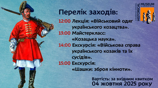 - 14:00 Екскурсія: «Військова справа українського козаків та їх сусідів».
